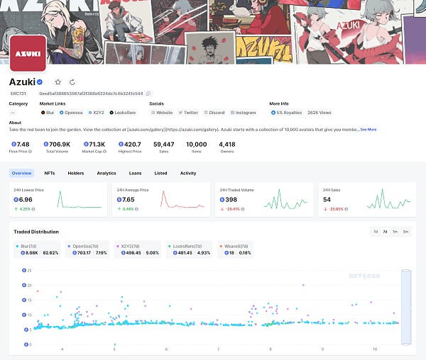 本周热门 NFT 为 Azuki 系列:自 6 月 28 日 Azuki 推出了 NFT Elementals 系列整体暴跌后陷入信任危机之后,7 月 9 日,Azuki 发推称社区已经投票决定不改变 Elemental 收藏的背景元数据,决定不改变的投票率为 86.9%。域名北京将在未来几周内以链下装备的形式出现在收藏家的资料中。据数据显示,目前以太坊上 BAYC 的链上版税收入已超 5800 万美元,Otherdeed for Otherside 超 5200 万美元,Azuki 超过 4300 万美元。过去 7 天交易分布主要为 Blur(82.62%)、Opensea(7.19%)、X2Y2(5.08%),过去 7 天交易额为 10.95k ETH,交易笔数 1.6k 次。