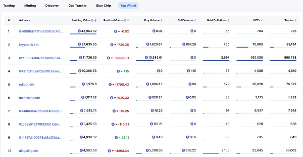 NFTScan 对排名前 1000 的 NFT 持仓价值钱包地址进行了分析,当前持有价值排名前 10 如下图所示:Top1 钱包:0x8088d74111a2368f5b7f0064a581d3bb72e6527e