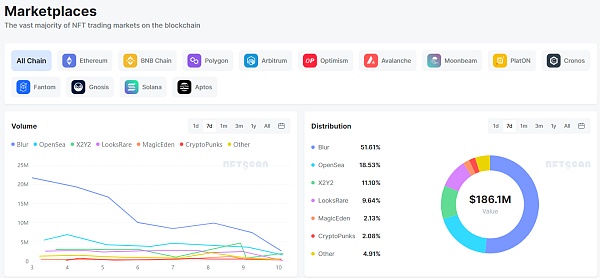 本周:大部分交易市场走势较起伏,下降走势明显,市场情绪冷淡。整体交易额在 3 日达到最高,7d 总交易额 $186.1m较上一周($311.1m)有近 $125m 的下降,Blur 占比 51.61% 占市场近 5 成 。排名前六的交易市场及占比分布: