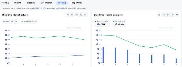 当前 19 只蓝筹合约总市值为1,663,757ETH,占 NFT 总市值的 33.54%。本周:蓝筹 NFT 总交易额为 47.77k ETH,市场总交易额为 90.39k ETH 整体较前一周有大幅度下跌,蓝筹 NFT 的交易额占市场比重上升。截至 7 月 3 日 00:00 交易额达到最高为 10,330e 左右。