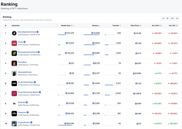 Ethereum 网络上最热门、交易量最高的 Top 10 NFT 项目如下图所示:本周 BoredApeYachtClub 依旧位列第一,目前地板价在 34e 左右相较于上周有一定回弹,Azuki 位列第二,由于上周 NFT Elementals 铸造处理不当的责任和铸造流程存在重大缺陷导致 Azuki 暴跌至 5.8e 目前回弹至 7.48e ;Elementals 系列上周交易额为 4,558e,地板价现已 1.32e 左右。除此之外,DeGods 较为稳定居于前十。市场冷淡,蓝筹整体市场交易额均出现降低。