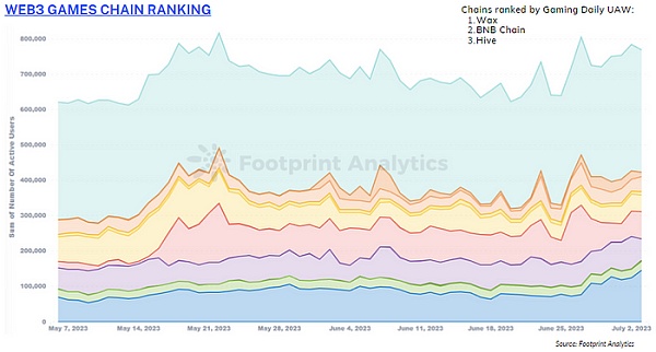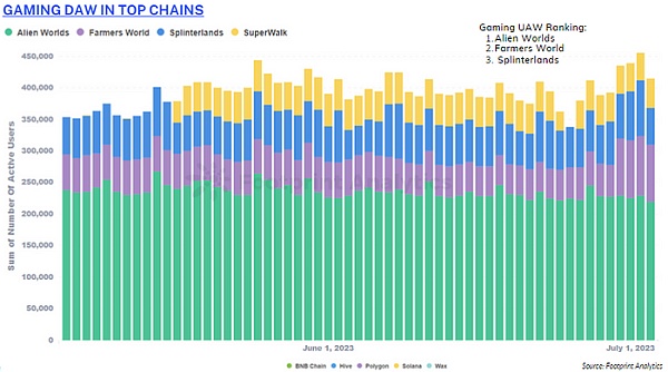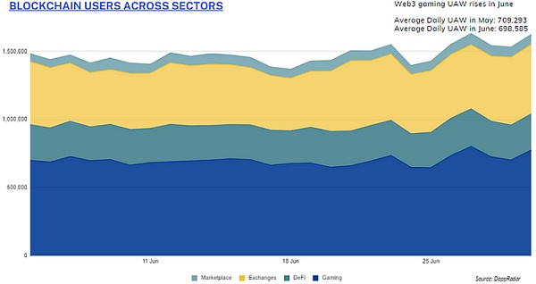 六月对于游戏行业来说是一个温和的月份,该领域发布了大量积极的公告。6 月份游戏每日 UAW 下降 1.5 %,当月平均游戏独立钱包交互次数为698,585 次。