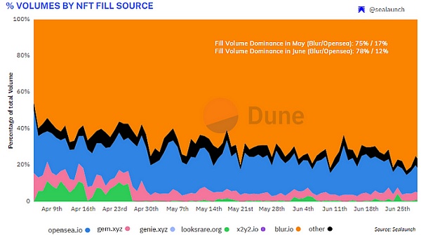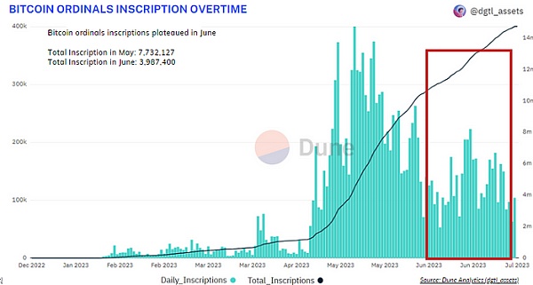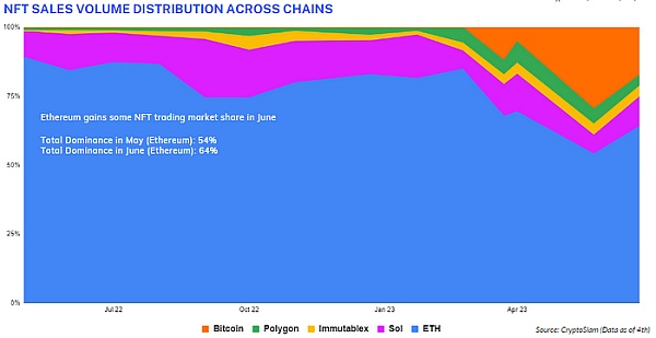 以太坊和 Solana 等知名区块链上的 NFT 交易量在 6 月份出现了显着增长,但比特币的交易量出现了最严重的下降,前一个月下降了 46 % 。然而,Ordinals 一直在继续吸引 NFT 投资者,并在 6 月份受到关注,主要是因为它们建立在比特币的基础上。比特币继续超越 Solana,占据 NFT 交易第二大链的称号。