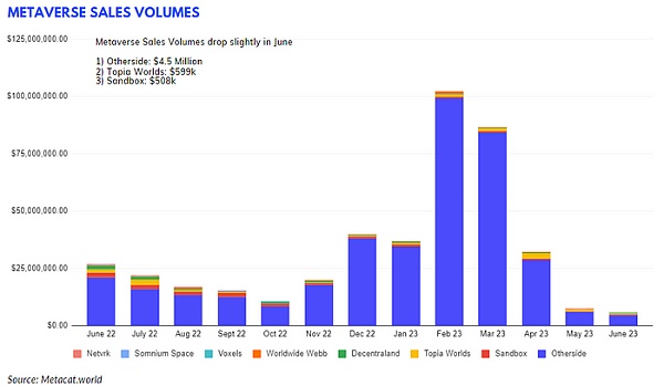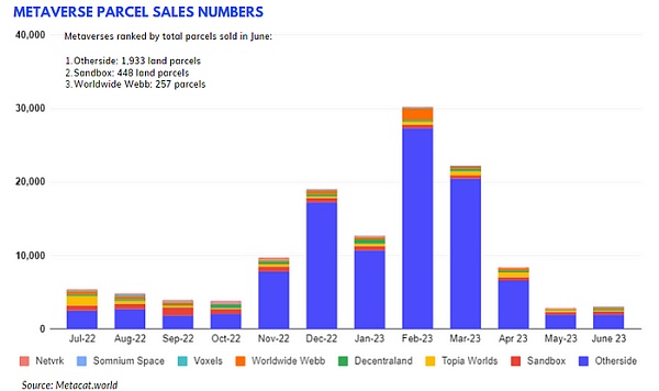 6月元界行业整体表现平淡,表现一般。元界包裹当月销售额为580万美元,环比下降21.62%。尽管如此,由于大多数元宇宙世界的销售数字都有小幅增长,因此售出的地块数量正增长了8.48% 。