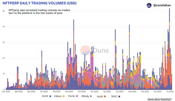 在价格下跌的情况下,NFTFi 市场中的某些子行业变得越来越突出,尤其是 NFT 永续协议。随着下个月市场动态的展开以及 NFTperp 推出的新 v2 版本,这些协议的交易量激增,值得密切关注。