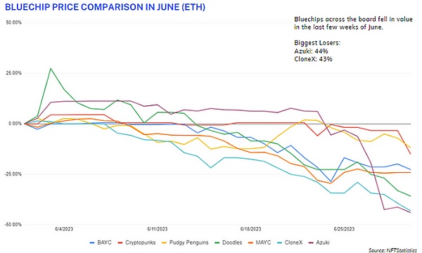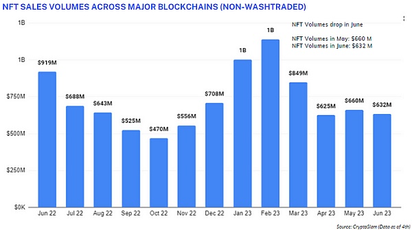 整个 NFT 市场 6 月份的表现相当令人失望。剔除清洗交易后,主要区块链上的 NFT 市场交易量为 6.32 亿美元,环比下降 4.6%。此外,知名NFT项目底价大幅下跌,平均下跌28%,标志着6月底出现大规模抛售时刻。