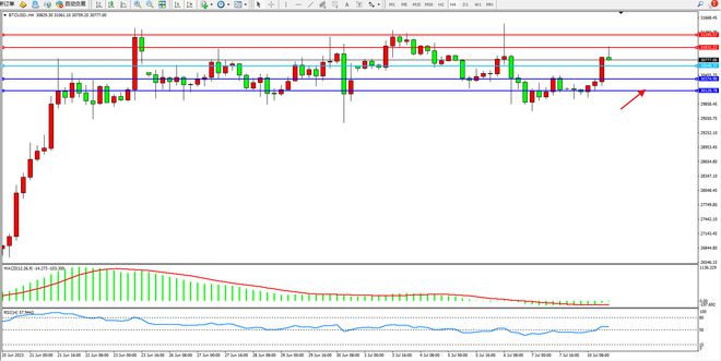 4小时图看,比特币多头势头依然震荡上行,短线看涨情绪显现,多头行情持续上涨,MACD指标弱势徘徊在0轴下方,RSI指标弱势整理于50平衡线之上。