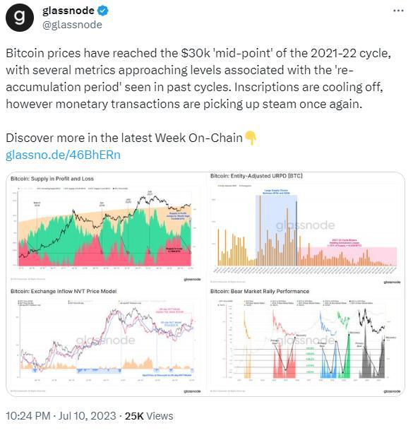 周二(7月11日)凌晨,比特币涨破31000美元后迅速回落。加密巨鲸在三周时间内,加速增持7.1万枚比特币,约21.6亿美元,证明大户正积极吸筹。据链上多项指标显示,比特币已处在盈亏平衡的均衡点,逼近“再积累期”的阶段。