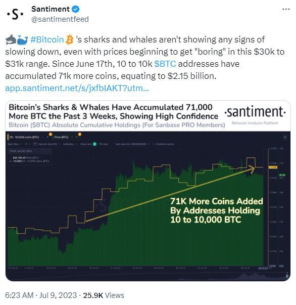 “比特币巨鲸并没有减缓吸筹速度,即使比特币行情在30000 -31000美元区间开始变得无聊,”Santiment写道。