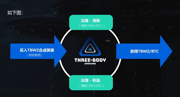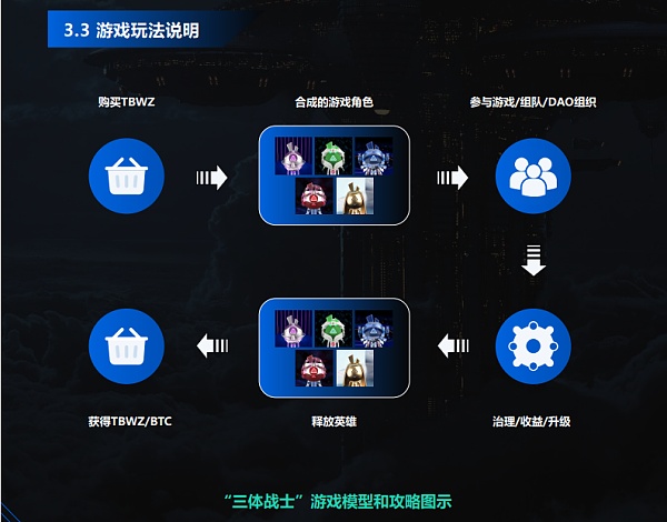 经查阅白皮书发现,该游戏以著名的的三体故事为原型的ARPG +MOBA类游戏,TBWZ铭文作为游戏的唯一令牌和英雄角色转化器,每个玩家通过质押TBWZ铭文随机获取英雄角色,进入游戏后,在游戏中参与治理、社交或Dao组织从而获得TBWZ/BTC奖励。