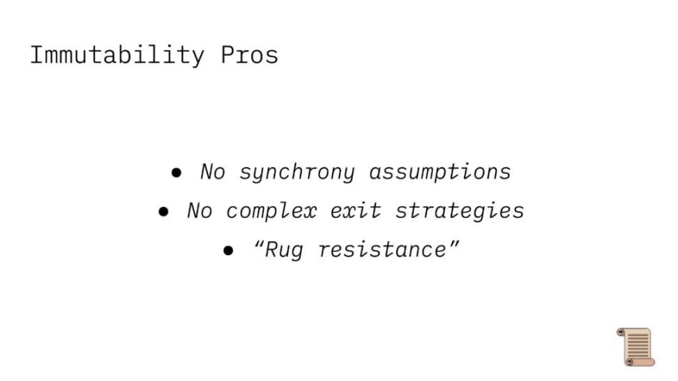 不变性的优点在于,不需同步假设,没有复杂的退出机制,防止 Rug。