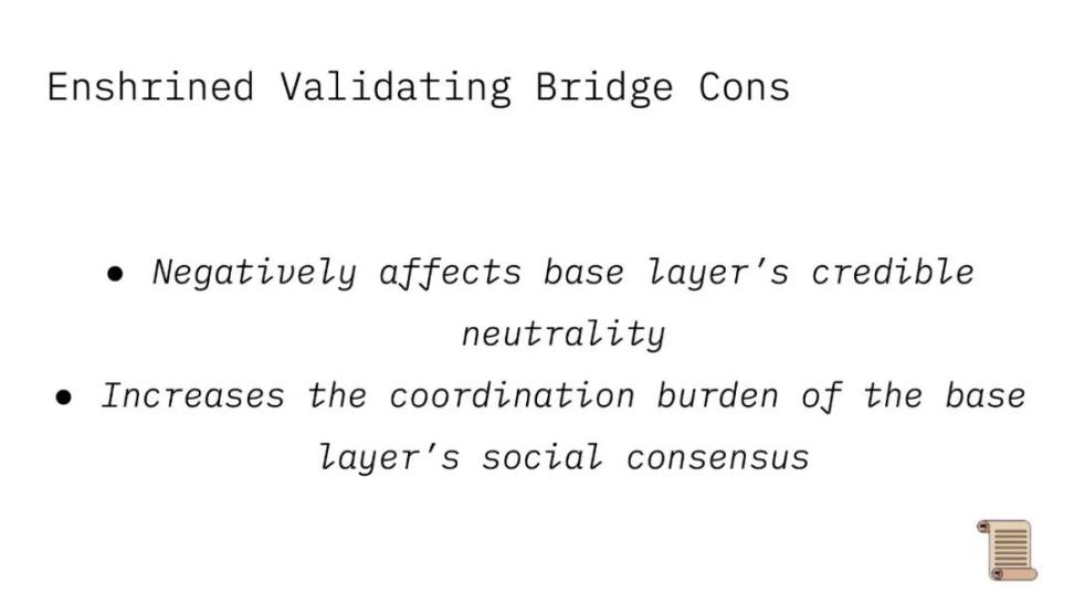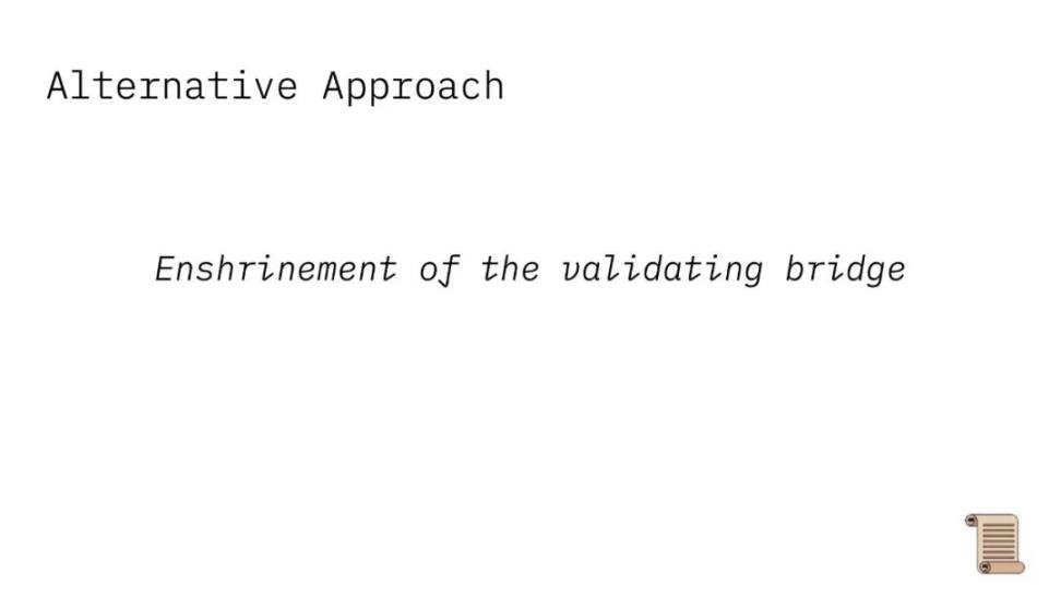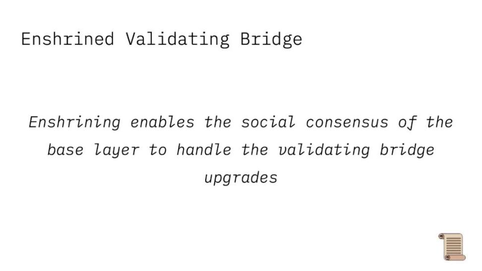 另一个方案是 Enshrined Validating Bridge。原理是不再通过跨链桥合约来验证 L2 的证明,而是通过内嵌在 L1 协议中,通过社会共识来验证证明。
