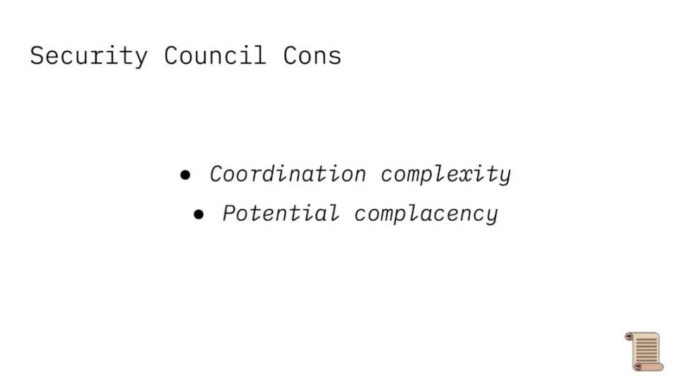 引入安全委员会也会带来新的问题,例如协调问题,还有潜在的不做验证直接投票快速通过的问题。