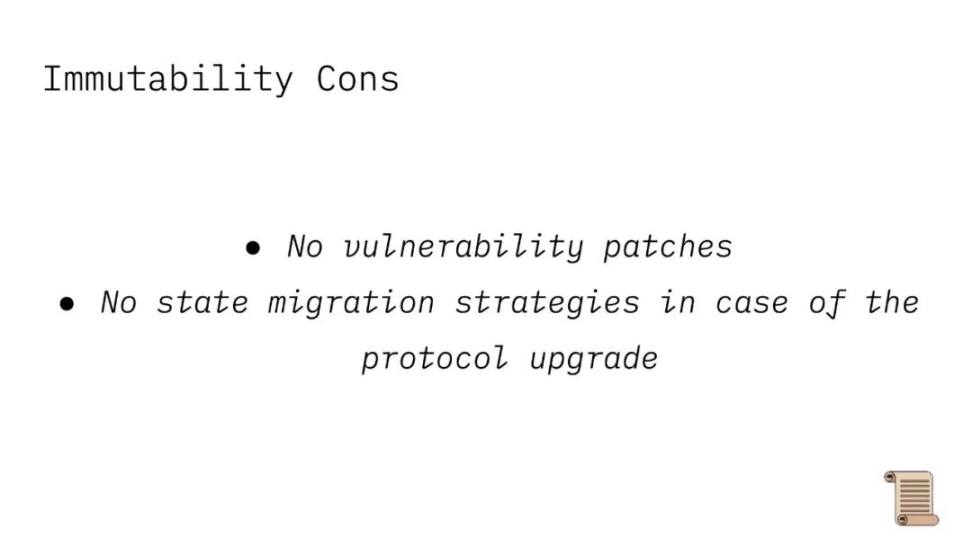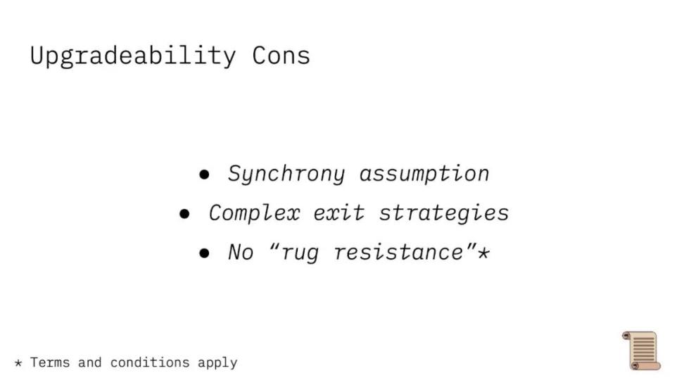 可升级性的缺点在于需要同步假设,有复杂的退出机制,无法防止 Rug。