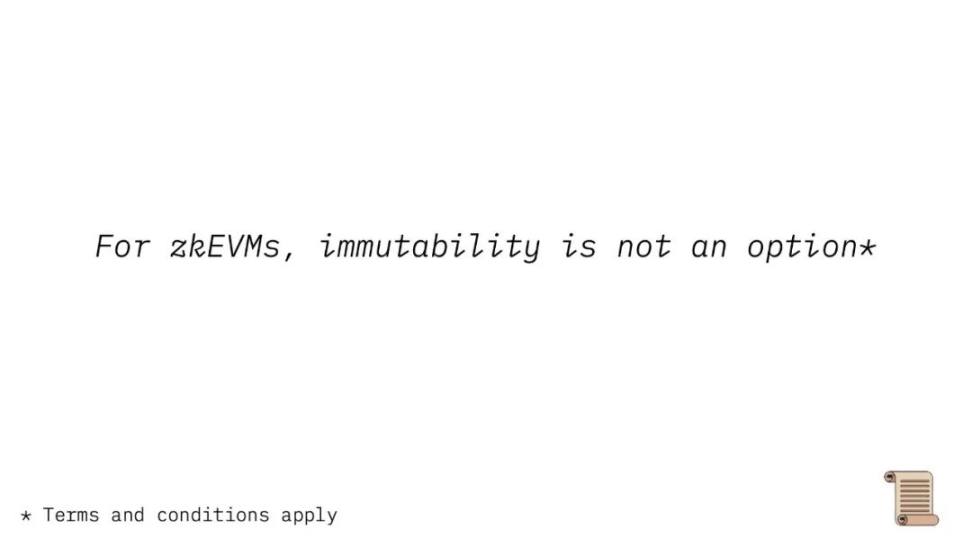 对于 zkEVM 而言,理想状态下,我们希望 zkEVM 拥有不变性来保障安全性,但同时,我们希望 zkEVM 保持兼容性,因此需要有可升级性。
