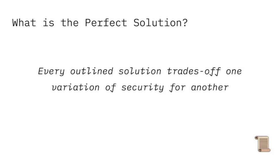 所以有完美的解决方案吗,实际上目前并不存在。每一个上文提出的方案都对安全性的其他方面做出了取舍。当然我们期待在未来两年,随着 L2 协议的完善,会达成共识有一个合理的解决方案。