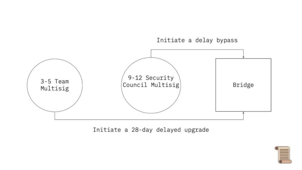 通常情况下,在内部团队 3/5 的多签钱包发起 28 天的延迟升级,9/12 的安全委员会多签可以发起快速通过延迟。