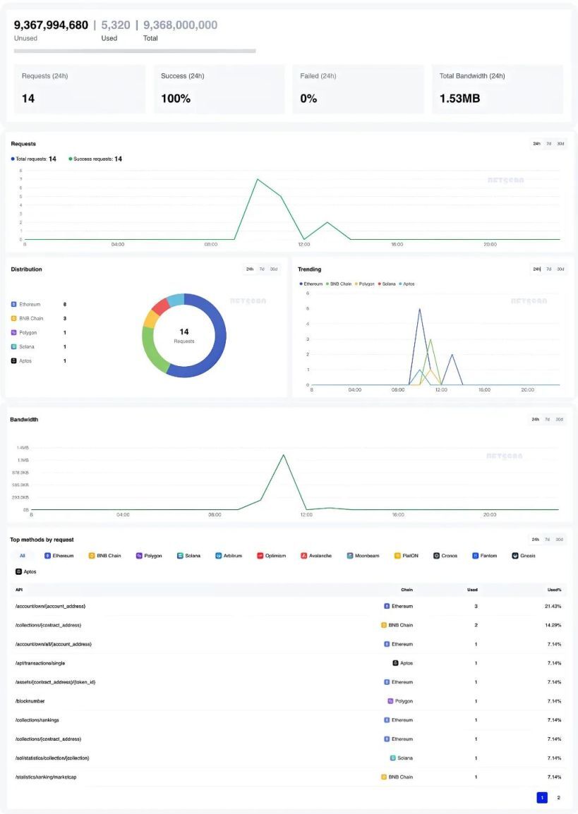 在 Dashboard 中,开发人员还可以查看自己 API 使用情况的统计数据,帮助记录历史使用数据。不仅如此,NFTScan 还为每位注册开发者提供每天 1 万次免费的 API 调用服务。