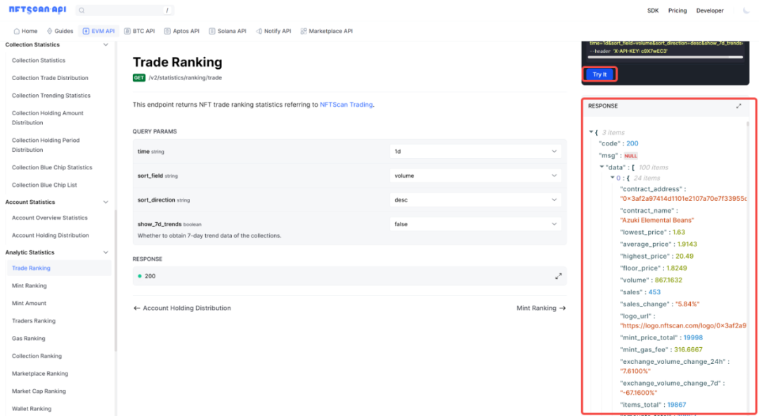 点击 Try it 返回数据包括 Trading 排名前 100 所有 NFT Collection 及其全面数据等个 24 items: