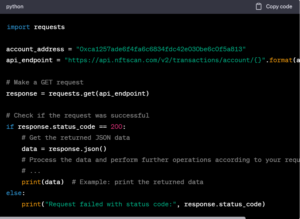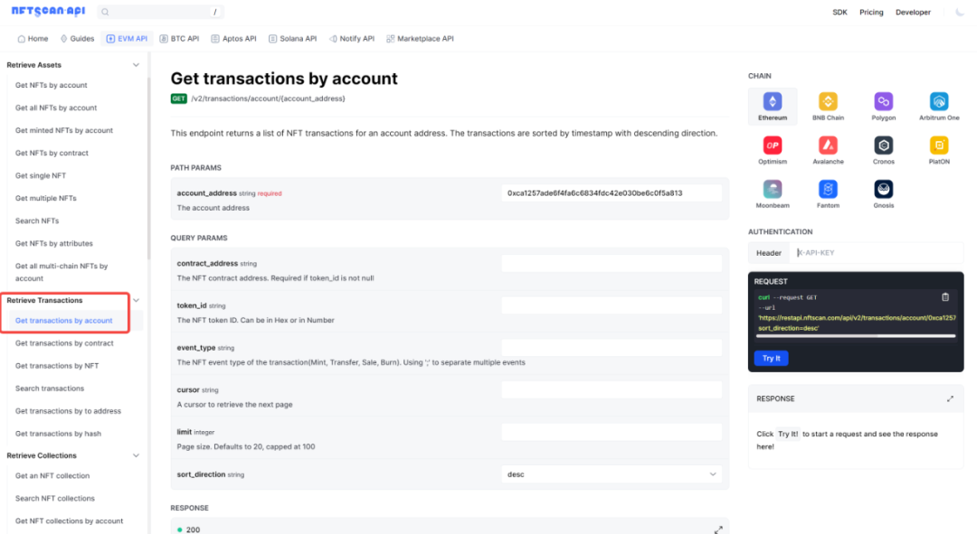 请注意,以上示例代码仅为简单展示如何使用 NFTScan NFT API 发起请求,获取特定地址的 NFT 交易记录,开发者可以根据自己的需求进一步处理返回的 JSON 数据,例如提取交易详情、解析时间戳等。此外,确保已正确安装 requests 库,并根据需要进行适当的身份验证或添加其他请求参数(例如 API 密钥等),以符合 NFTScan NFT API 的要求,来获得更多关于请求参数和数据格式的信息。