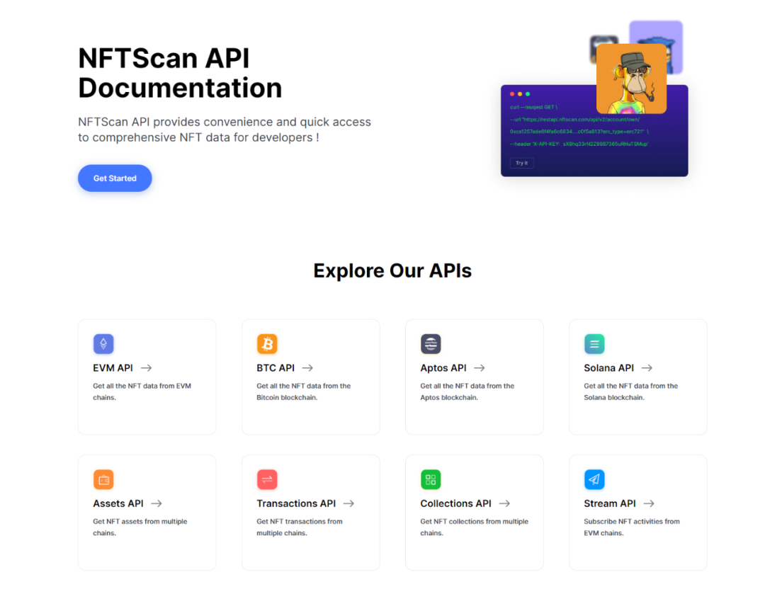 NFTScan 目前拥有全网最大最全的 NFT Collection 库,已支持 Ethereum、Solana、BNBChain、Bitcoin、Polygon、Aptos、Avalanche、Arbitrum、Optimism、Fantom、Moonbeam、PlatON、Cronos、Gnosis 14 条区块链的 NFT 全量数据,所涵盖的 NFT 数据全、种类丰富,提供一整套的接口来获得 ERC721 和 ERC1155 资产以及交易、项目、市场统计等信息,现在支持 50 多个针对 EVM 兼容链的公共接口,以及针对 Solana、Aptos、Bitcoin 的一批相同模型的接口,很大程度上满足了开发者索引多种类型的 NFT 数据的需求。