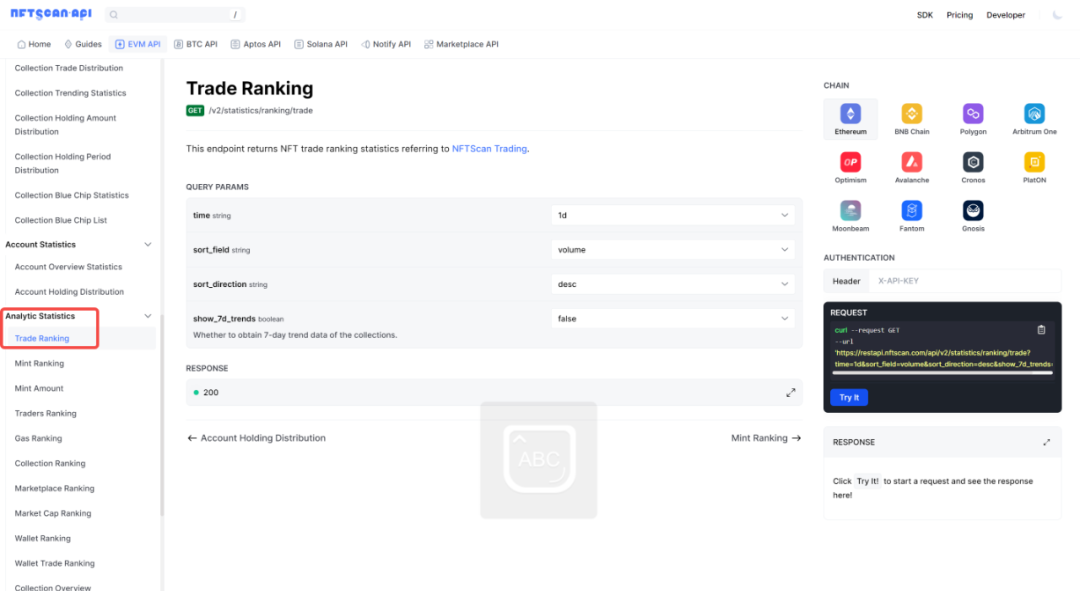 Trade Ranking API:NFT 链上追踪器 NFT Ranking 排行榜信息是首先十分重要的,包括目前 NFT 热门趋势,展示当前最热门的 NFT 排行榜,即最受关注和交易活跃的 NFT 集合。