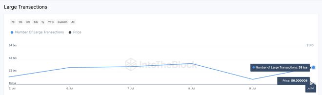 下面的IntoTheBlock数据显示,7月6日SHIB鲸鱼交易只有26笔。但到7月10日收盘时,已经增加到38笔鲸鱼交易。