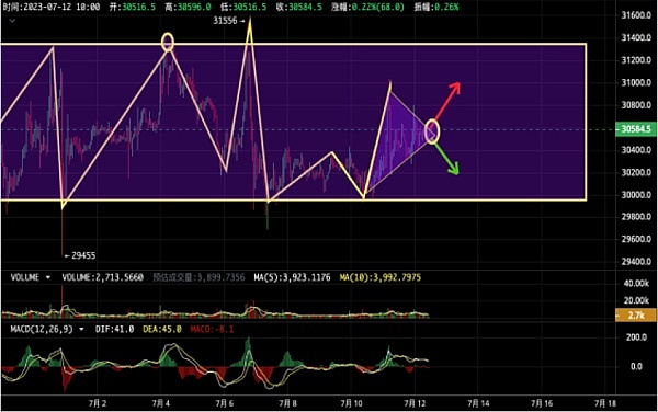 美国6月CIP公布前夕,加密市场仍以弱势震荡为主,比特币沿5日均线弱势震荡,1小时级别走势目前在30000—31500大区间内运行, 比特币30分钟走势呈三角整理形态.日内关注整理结束方向的选择.