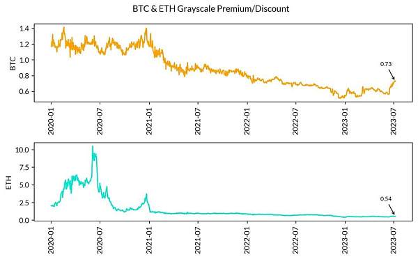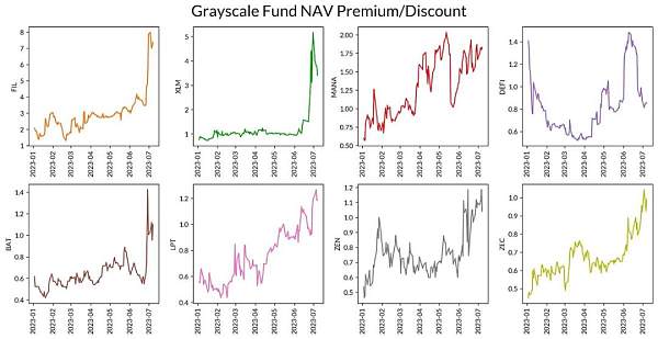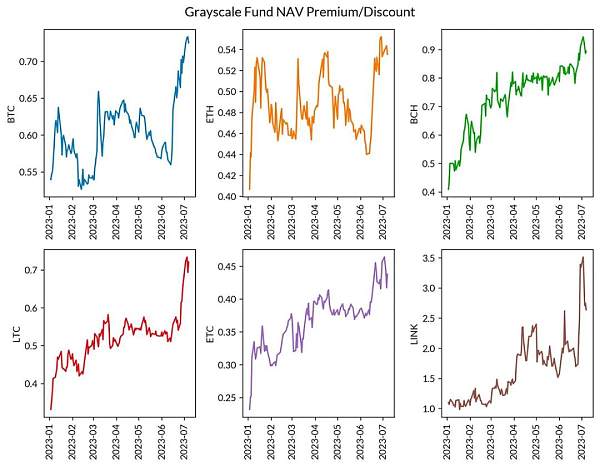 如果我们看一下上面的图表,我们可以看到为不同资产设立的各种信托发展得非常不同。虽然 ETH 的折扣率大约在 50% 左右,但 BTC、BCH、LTC 和 ETC 的趋势更接近平价,而 LINK 实际上超过了平价,以 270% 的溢价交易。这种趋势可能是由于投资者意识到,最近有消息称贝莱德已经申请创建现货比特币 ETF,如果 Grayscale 也获得将这些基金转换为 ETF 的批准,价格将与平价相匹配。虽然我们可能认为这听起来有些牵强(因为这意味着人们支付的价格是现货价格的近三倍),但对于流动性特别差的投资工具来说,这种情况很常见,尤其是当投机性资金流动占主导地位时。我们可以从下面看到 Grayscale 提供的其他信托的相同行为。
