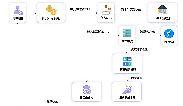 用户通过HashKing,将FIL 1:1铸造为NFIL,再将NFIL存入HashKing,HashKing将会把收到的FIL质押到矿工节点,矿工封装算力后参与FIL主网挖矿,获得的收益一部分将作为保证金,另一部分将作为收益返还给用户。