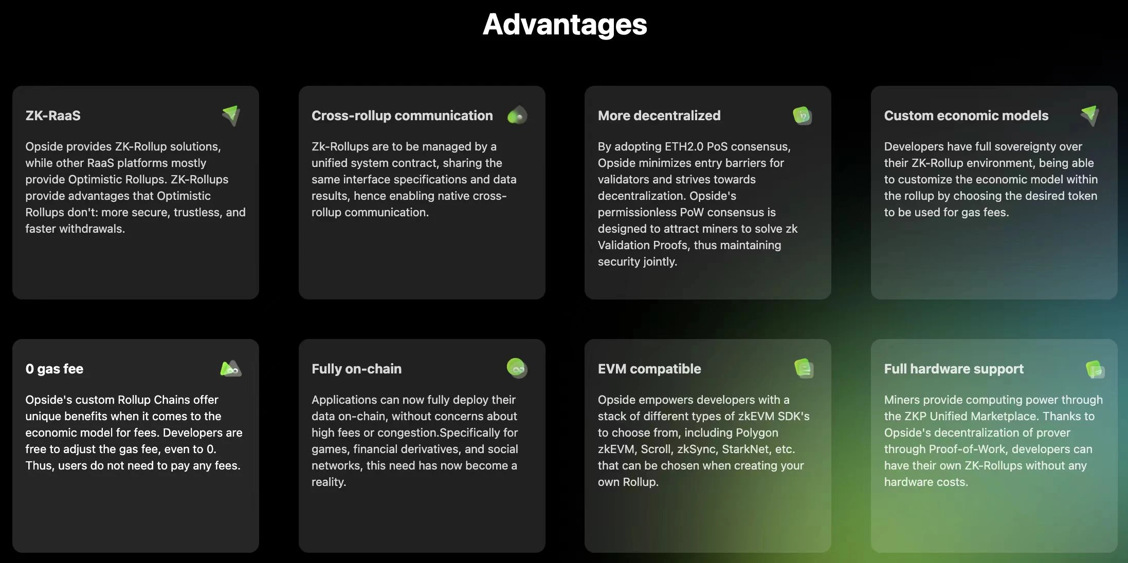Opside 作为一个去中心化的 ZK-RaaS 平台和支持 ZKP 挖矿的 PoW 网络,加速了基于 zkEVM 的应用链的大规模落地。Opside 不仅提供了一键生成 ZK-Rollup 应用链的功能,为开发者减轻了技术负担,也利用其 ZK-PoW Cloud 满足了因 ZK-Rollup 增多而产生的 ZKP 计算任务的算力需求,为全球矿工创造了全新的挖矿场景。