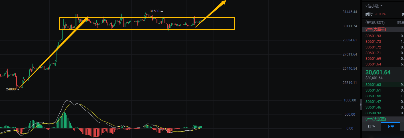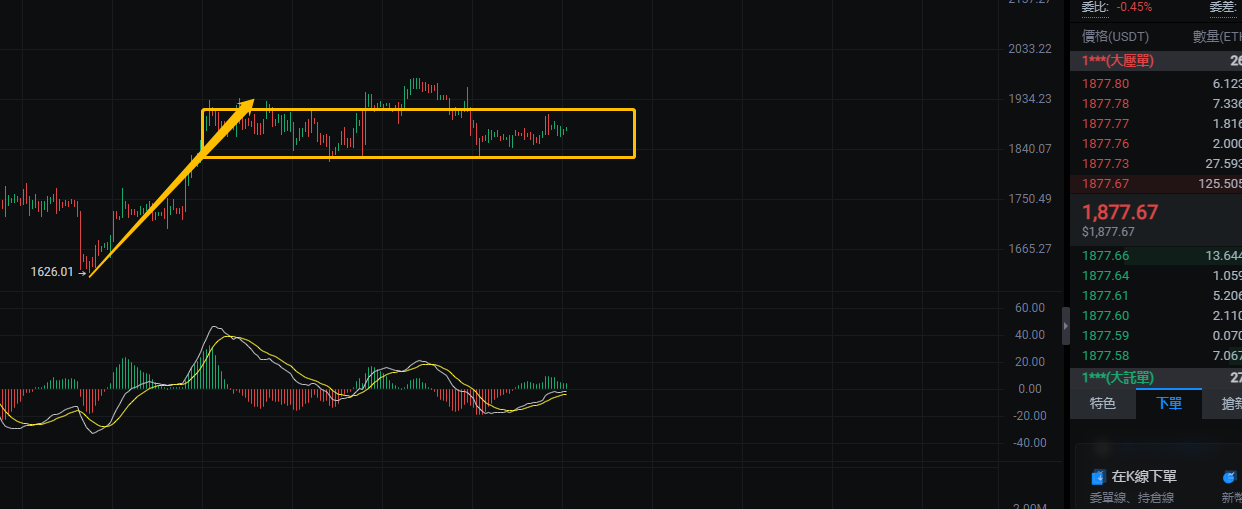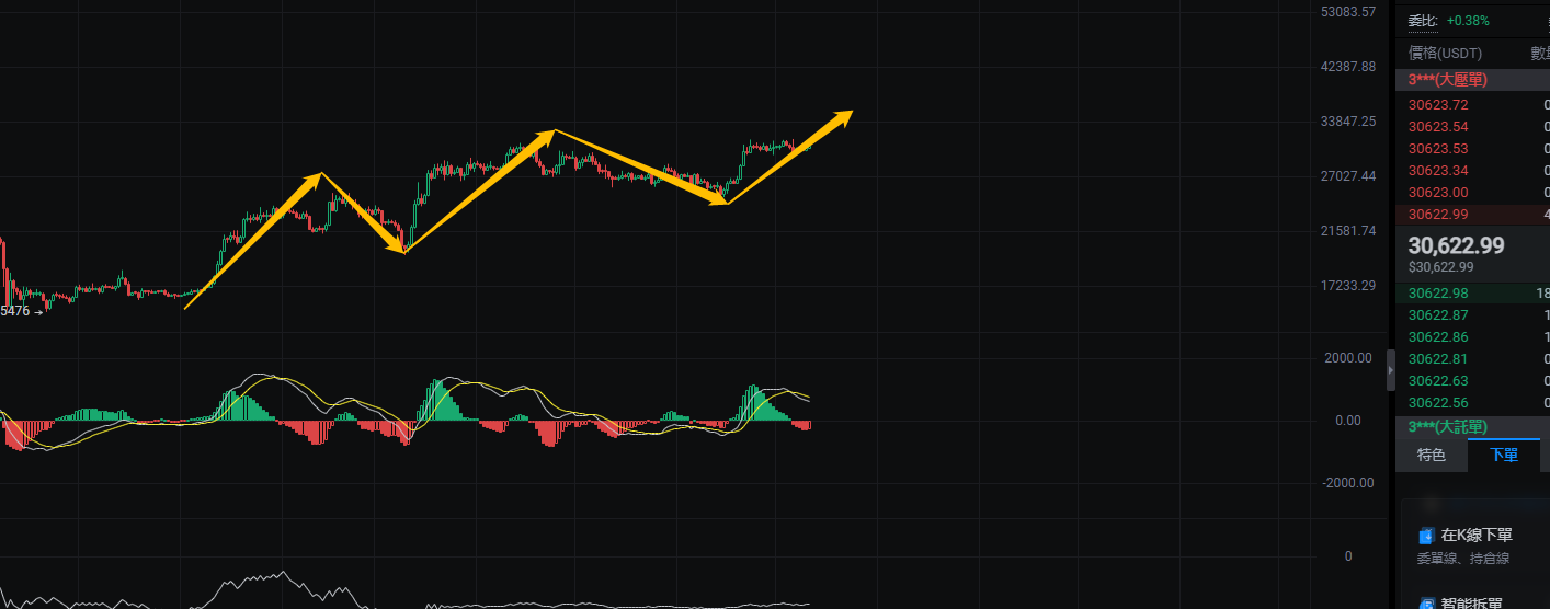 大饼日线级别的走势。目前可以看到大饼日线级别的走势的话就是处于一个第五笔的上升,不过仔细看的话其实日线的第四笔和第一笔的最高点是有接触的,说明可能还有一个可能性就是这里走了一个日线的奔走中枢。主要还是看目前现在阶段正在运行的这笔日线笔的上升的力度如果,如果背驰第三笔日线笔的上的话那么就结束了一笔日线的上升,最好的情况就是走一笔日线级别的回调,不跌破2.5W如果跌破2.5W的话那么就很有概率还得去2W附近一趟。那么就是走一笔周线级别的下跌了。所以咱们要做好预期。好的情况还得去一趟2.5W不好的情况就得去一趟2W附近了。