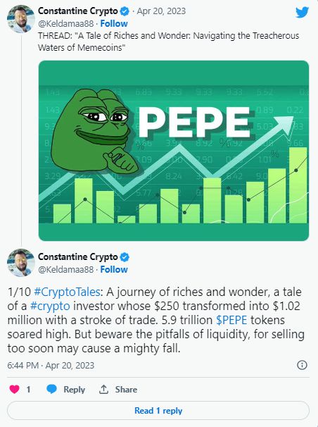 IB_JUNIOR 的故事是将小额投资变成数百万美元的众多故事之一。另一位匿名交易员在 4 月中旬购买了价值 250 美元的 PEPE。这笔小钱很快变成了102万美元。