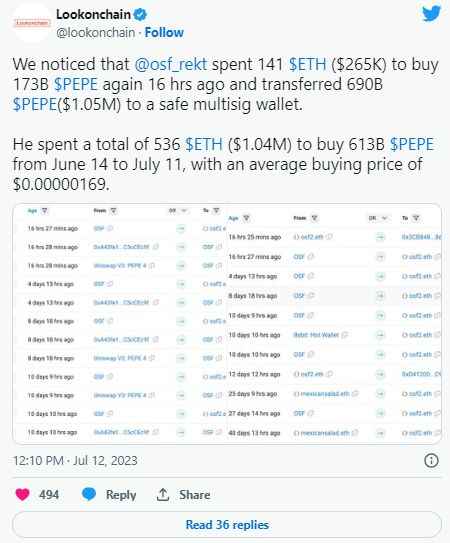 该分析公司指出,该交易员在 6 月 14 日至 7 月 11 日期间总共花费了 536 ETH(104 万美元)购买了 6130 亿个 PEPE 代币。