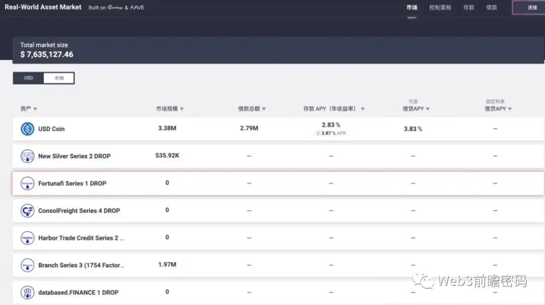 Aave 紧跟 MakerDAO 其后于 2021 年宣布上线 RWA 市场,同样允许真实资产的抵押借贷。和 MakerDAO 一样,Aave 采用了 Centrifuge 作为 RWA 提供商,其 RWA 市场使 Aave 储户能够针对真实世界抵押品赚取收益,同时 Centrifuge 资产发起人可以从 Aave 借入资金。目前 Aave RWA 市场规模在 763.5 万美元左右,且只有一个 USDC 市场还能提供存借 APY,其他市场都已经不再提供。