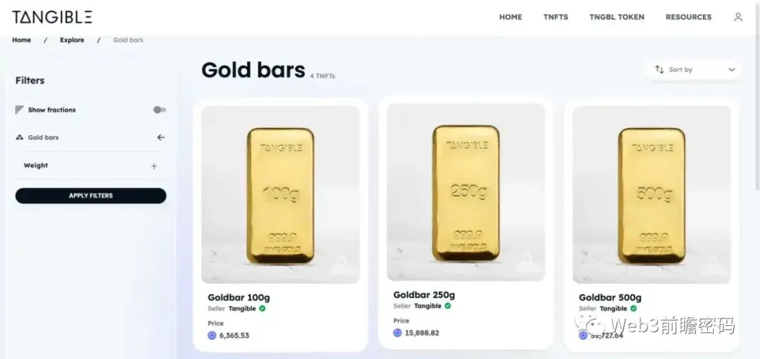 Tangible 是一个可以投资黄金、酒、手表等现实世界实物资产 NFT 投资平台。在 Tangible 上,用户可以使用 Tangible 的稳定币 USDR 从全球供应商受众购买黄金、酒、手表等实物商品,支付成功后会铸造一个 TNFT(「有形非同质代币」)作为购买实物的凭证。实体物品会被发送到 Tangible 的安全且有保险的存储设施之一,而 TNFT 被发送到买家的钱包。用户也可以在 Tangible 创建有实物支撑的 NFT 市场售卖商品。