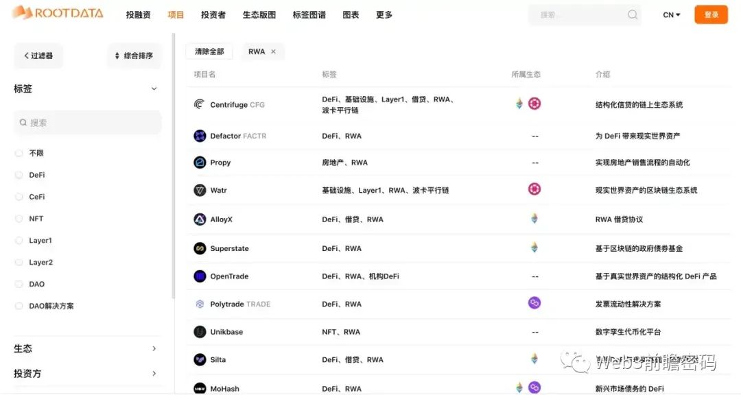 由于 RWA 概念定义很广,该领域的实际发展面貌感受起来很模糊,本文主要结合加密数据平台 RootData 的 RWA 板块,梳理具体的 RWA 概念下较为头部的项目进展和一些在融资或者模式上等方面有所亮点的早期项目,一览 RWA 赛道的发展情况。