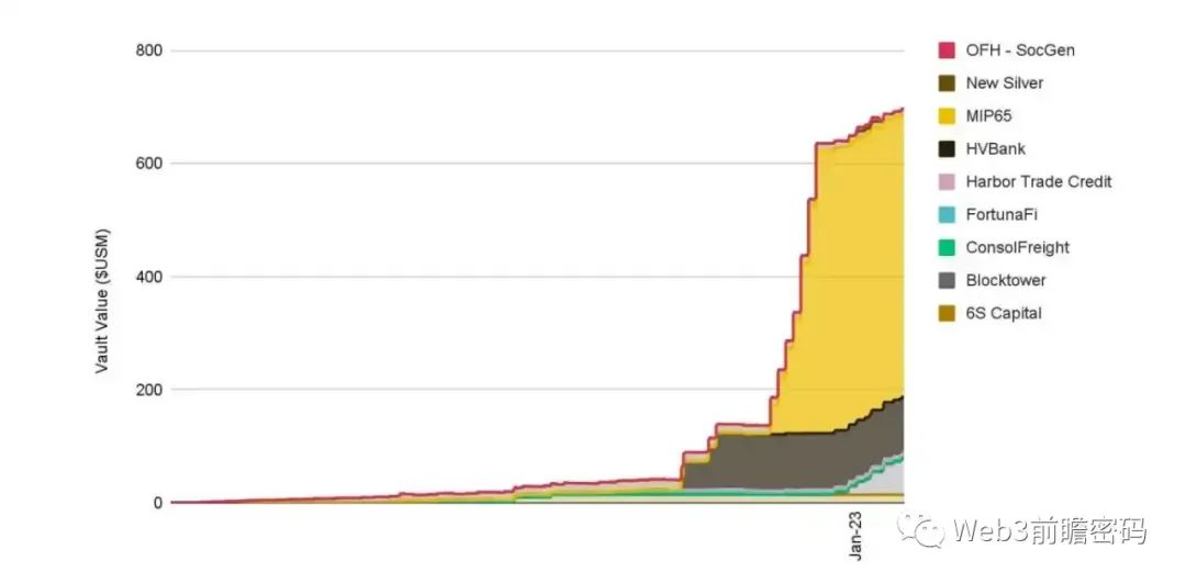 MakerDAO 先后设立了多个 RWA 金库,而 RWA 金库大部分抵押品为美债。而今年在 DeFi 整体低迷的当下,MakerDAO 持续加大了 RWA 的布局,尤其是对于美债的投资。