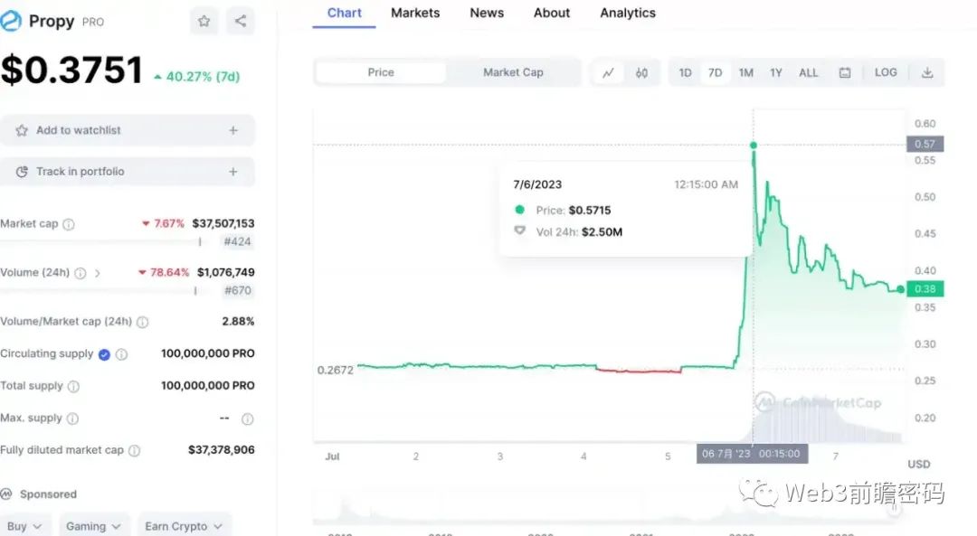 7 月 6 日,Propy 还宣布融合 AI 人提到房地产交易效率。或在 RWA+AI 的双热点叙事下,Propy 代币 PRO 一度从 0.268 美元上涨到 0.571 美元,涨幅超 200%。