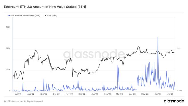 尽管以太坊地址的活动相对较低,但质押格局一直在稳步扩大。Glassnode 的质押图表显示,每天质押的新 ETH 持续增加。