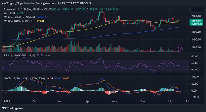 截至撰写本文时,以太坊的交易价格约为 1,880 美元,价值小幅上涨约 0.6%。分析每日时间框架图表,似乎上升趋势尚未开始。