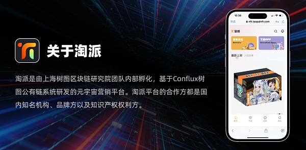 淘派是由上海树图区块链研究院团队内部孵化,基于Conflux树图公有链系统研发的元宇宙营销平台。淘派平台的合作方都是国内知名机构、品牌方以及知识产权权利方。