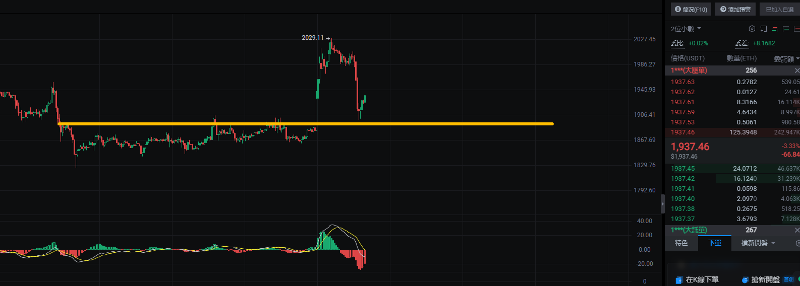 姨太1H的结构,姨太这笔1H的上的话其实还是处于突破的状态,目前只要不跌破黄色支撑线的话,那么还能够重新挑战2000的位置。所以姨太短期是比大饼强势许多的。耐心等待验证的结果。
