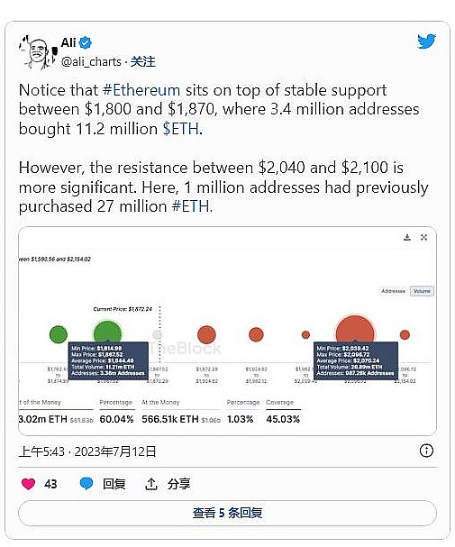 截至发稿时,以太坊 (ETH) 的交易价格为 2012 年美元,市值为 2410 亿美元。请注意,以太币 2,100 美元存在强大阻力,因为 100 万个地址已在 2040 美元至 2100 美元的价格范围内购买了 2700 万枚 ETH。