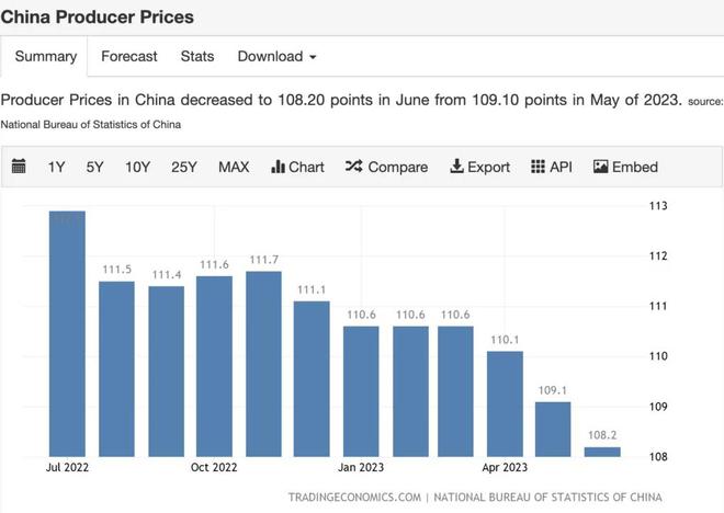 据中国国家统计局数据,6月份全国工业生产者出厂价格从5月的109.10点降至108.20点,连续第9个月下降,比去年同期下降5.4 %自2015年12月以来最剧烈的一次。