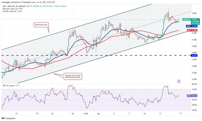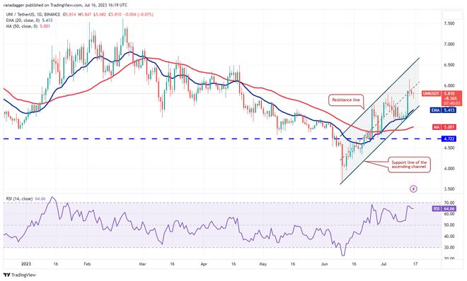 Uniswap (UNI) 在回调期间一直在 20 日均线(5.41 美元)处获得支撑,表明市场情绪已转为积极,交易者逢低买入。