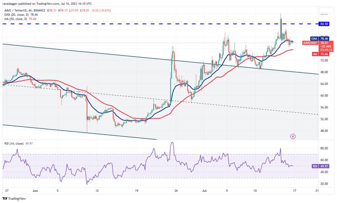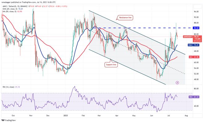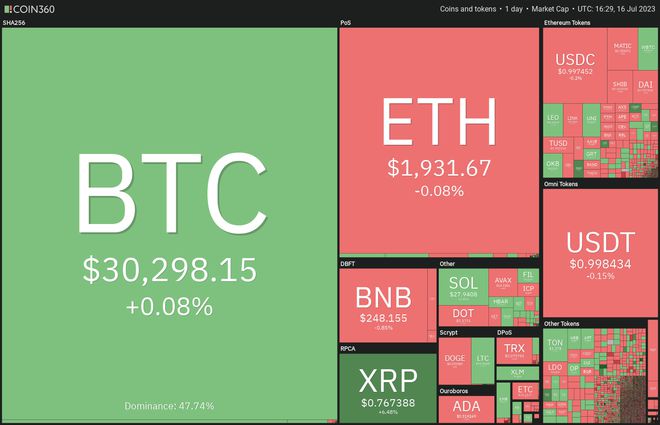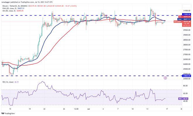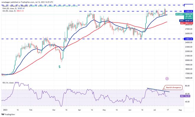 比特币在 7 月 13 日收于 31,000 美元上方,但事实证明这是一个牛市陷阱,因为空头将价格拉回到 7 月 14 日的水平以下。这表明空头正在激烈捍卫 31,000 美元至 32,400 美元之间的区域。