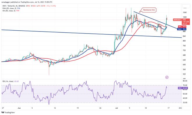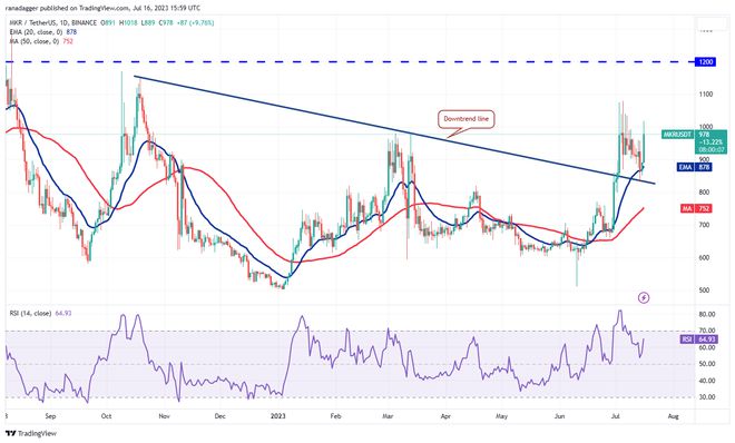 Maker (MKR) 于 7 月 2 日突破下降趋势线,并于 7 月 14 日成功重新测试该水平。从该支撑位反弹表明较低水平的需求强劲。