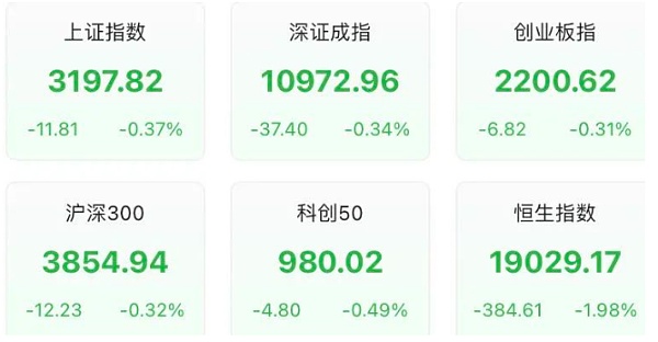截至收盘,沪指跌0.37%,报收3197.82点;深成指跌0.34%,报收10972.96点;创业板指跌0.31%,报收2200.62点;沪深300跌0.32%,报收3854.94点。
