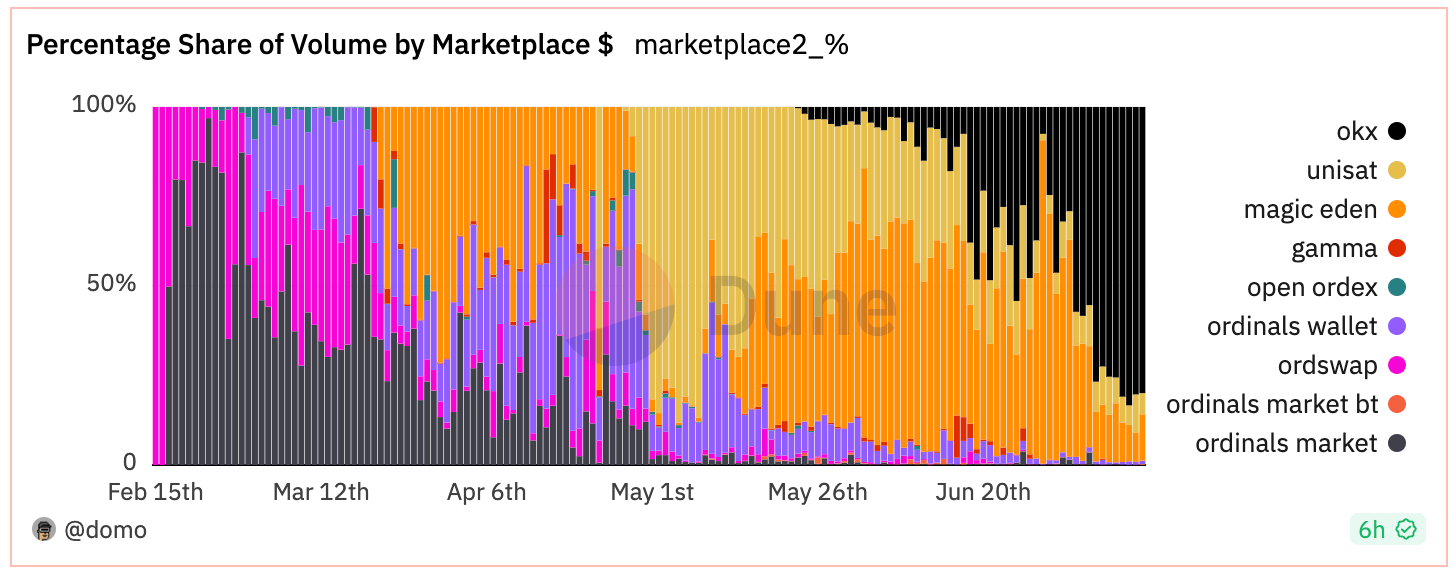 从市场占比来看,基本也就是 UniSat、OKX 和 Magic Eden 三家争霸。